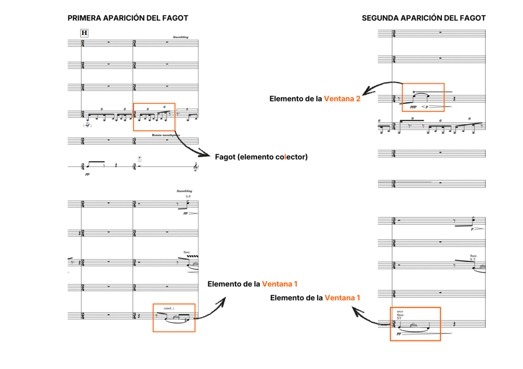 Allí, siempre en el mismo instrumento, el fagot, aparece una figura recurrente: un gesto que funciona como colector (y también como conector). Sobre ese gesto se superpone un material residual de la ventana que acaba de terminar.
